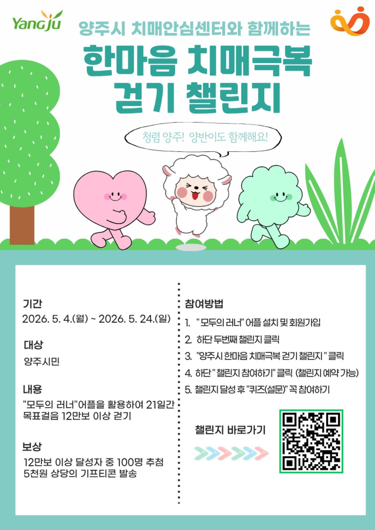 참여 방법은 간단하다. 앱 내 '챌린지' 탭에서 '양주시 한마음 치매극복 걷기 챌린지'를 선택하고 참여 버튼을 누르면 된다. 사전 예약도 가능하다. 21일 동안 총 12만 보 이상을 걸으면 목표 달성이다.