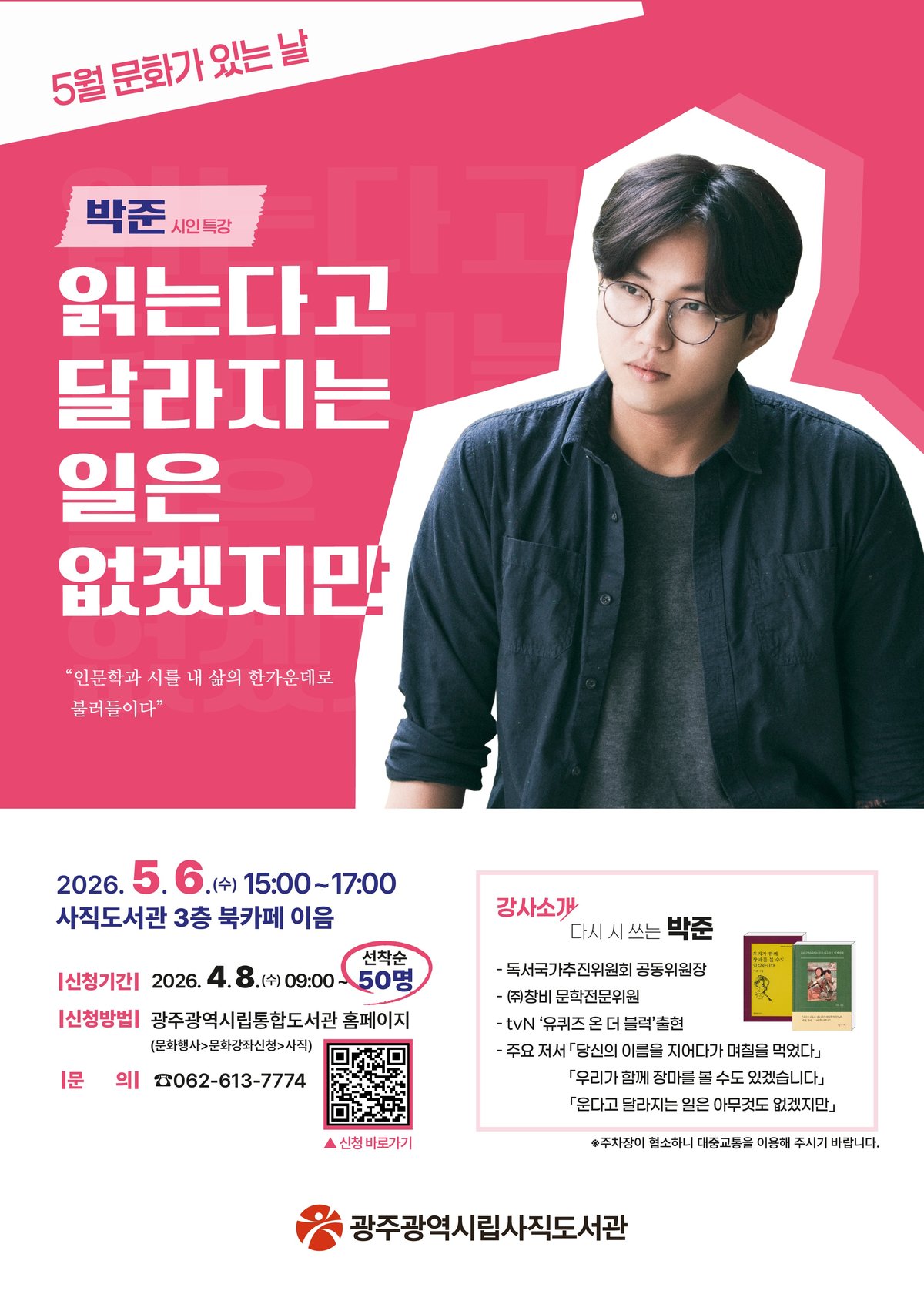 [PEDIEN] 광주광역시 사직도서관이 5월 '문화가 있는 날'을 맞아 특별한 강연을 준비했다. 5월 6일 북카페 이음에서 박준 시인을 초청, 시민들과 소통하는 시간을 갖는다.