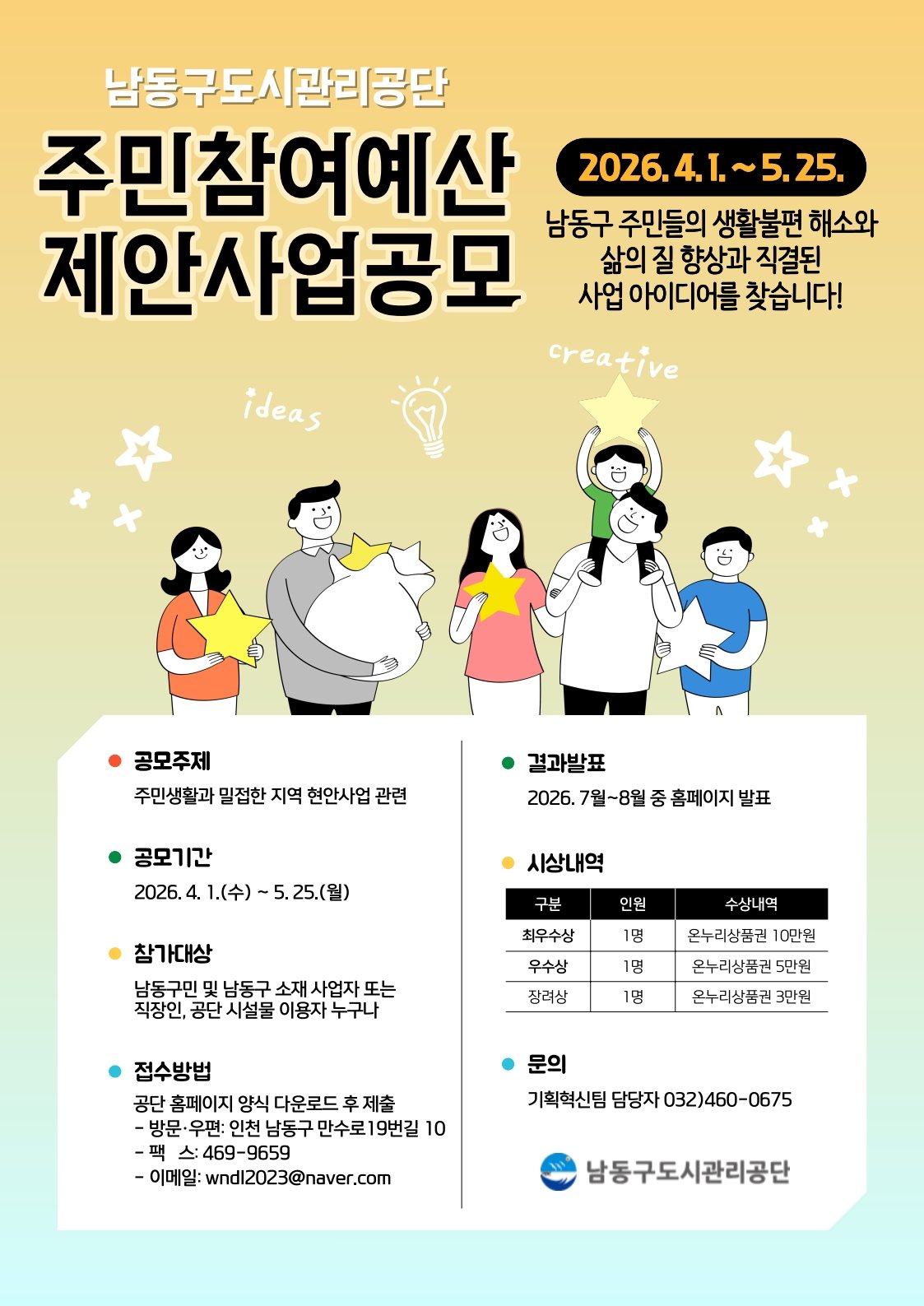 이번 공모는 4월 1일부터 5월 25일까지 진행된다. 남동구민은 물론 남동구 소재 사업자, 직장인, 그리고 공단 시설 이용자라면 누구나 참여 가능하다.