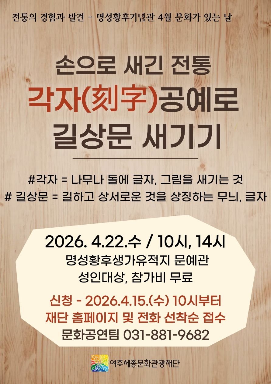 [PEDIEN] 여주시 명성황후기념관이 4월 문화가 있는 날을 맞아 특별한 프로그램을 진행한다. ‘손으로 새긴 전통, 각자공예로 길상문 새기기’ 행사가 오는 4월 22일 열린다.