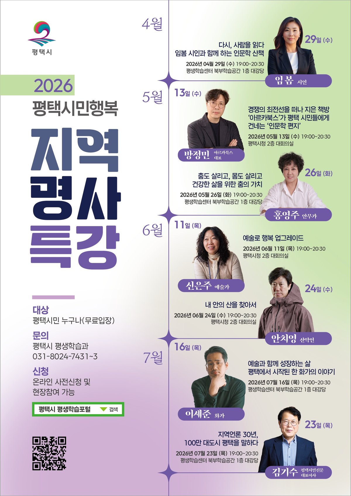 [PEDIEN] 평택시가 시민들의 지식과 교양을 증진하고 평택에 대한 이해를 높이기 위해 '2026년 평택시민행복 지역명사 특강'을 4월부터 7월까지 운영한다.