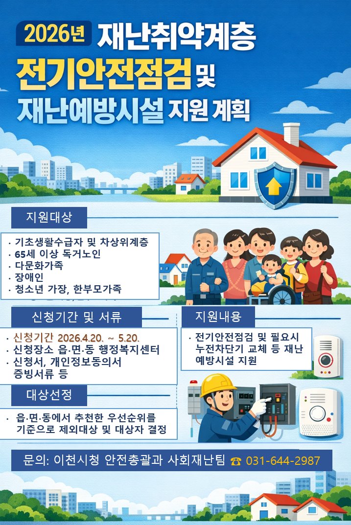 [PEDIEN] 이천시가 재난에 취약한 계층의 안전을 위해 전기안전점검 및 재난예방시설 지원 사업을 본격적으로 추진한다.