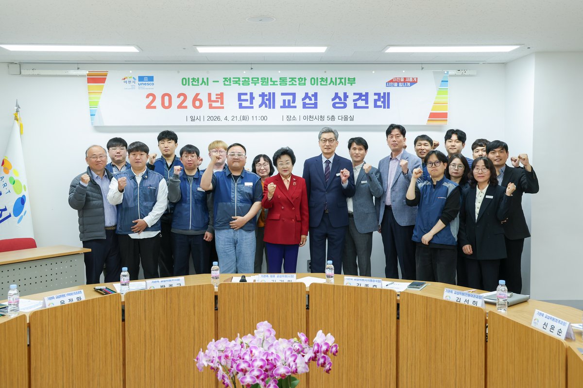 [PEDIEN] 이천시와 전국공무원노동조합 이천시지부는 4월 21일 시청 5층 다올실에서 노사 양측 대표 교섭위원인 김경희 이천시장과 이재인 공무원노조 지부장 등 노사 양측 교섭위원 20여명이 참석한 가운데‘2026년도 공무원노조 단체교섭 상견례’를 가졌다.