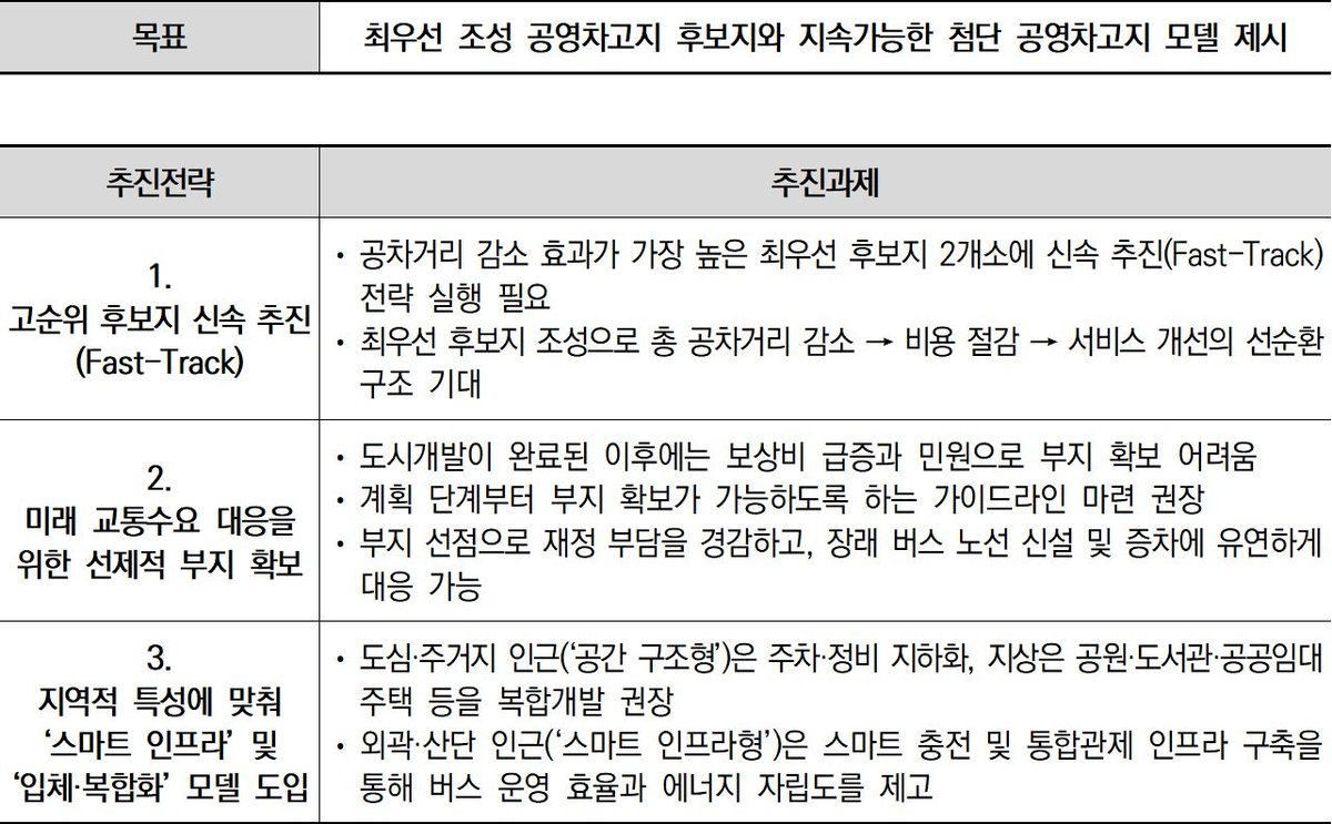 이어 “실제 신규 공영차고지 조성 사업 추진 시에는 버스 공차거리 감소효과 이외에도, 부지 확보 가능성, 지역 주민 수용성 등이 함께 고려되어야 한다”고 덧붙였다.
