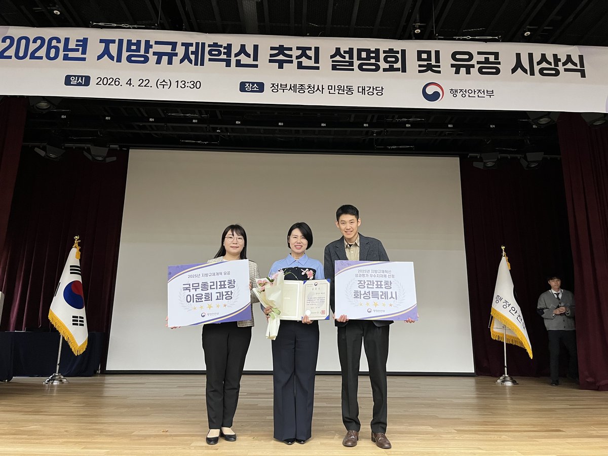 행정안전부 주관으로 열린 이번 포상에서 화성시는 단체 부문 행정안전부장관 표창을, 이윤희 효행구 돌봄복지과장은 개인 부문 국무총리 표창을 각각 받았다. 시상식은 22일 정부세종청사에서 개최됐으며, 전국 지방자치단체 규제혁신 담당자들이 참석했다.