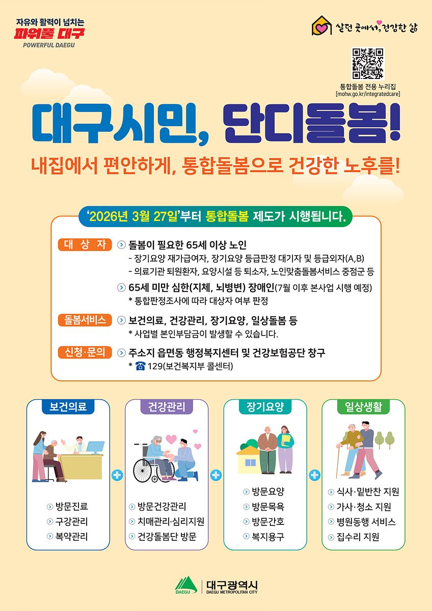 이재홍 대구광역시 보건복지국장은 “시행 한 달 만에 신청과 서비스 연계가 빠르게 늘어나며 시민들이 돌봄의 변화를 직접 체감하고 있다”고 말했다. 그는 “앞으로도 돌봄이 필요한 시민이 살던 곳에서 건강하게 생활할 수 있도록 더욱 촘촘한 통합돌봄 체계를 구축해 나갈 계획”이라고 밝혔다.
