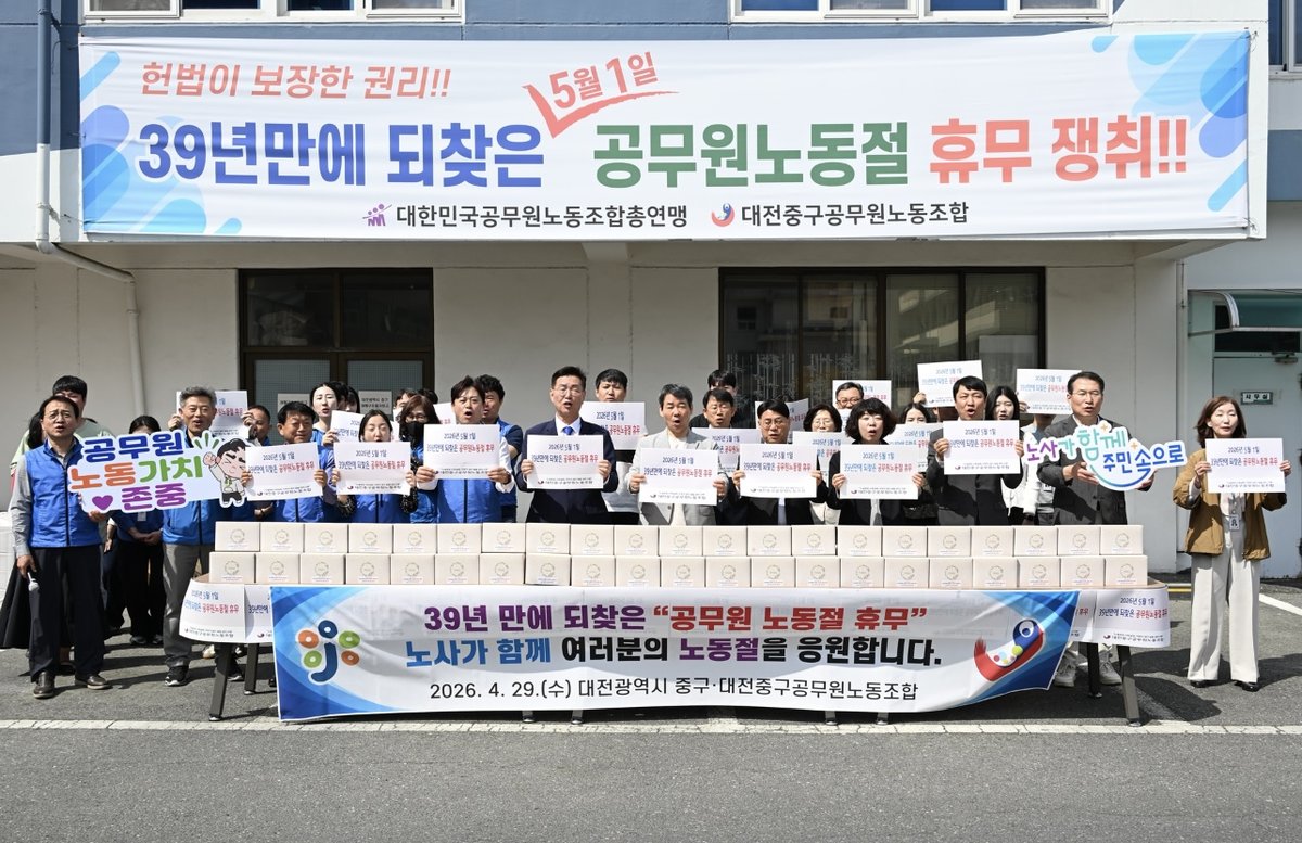 [PEDIEN] 대전중구공무원노동조합이 29일 오전 조합 사무실 앞에서 ‘39년 만에 되찾은 공무원 노동절 휴무 기념행사’를 개최했다. 이 행사는 63년 만에 노동절 명칭 복원과 2026년부터 공무원 및 교사에게도 5월 1일 노동절 휴무가 전면 적용되는 것을 경축하는 자리였다.