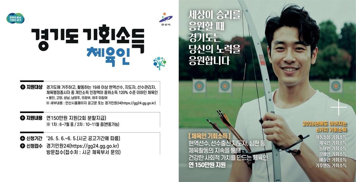 [PEDIEN] 안산시가 지역 체육인들의 안정적인 활동을 돕기 위해 경기도와 손잡고 '체육인 기회소득' 사업을 첫 시행한다. 사회적 가치를 창출하지만 정당한 보상을 받지 못했던 체육인들에게 연간 150만원을 지원하는 이 사업은 5월 6일부터 한 달간 신청을 받는다.