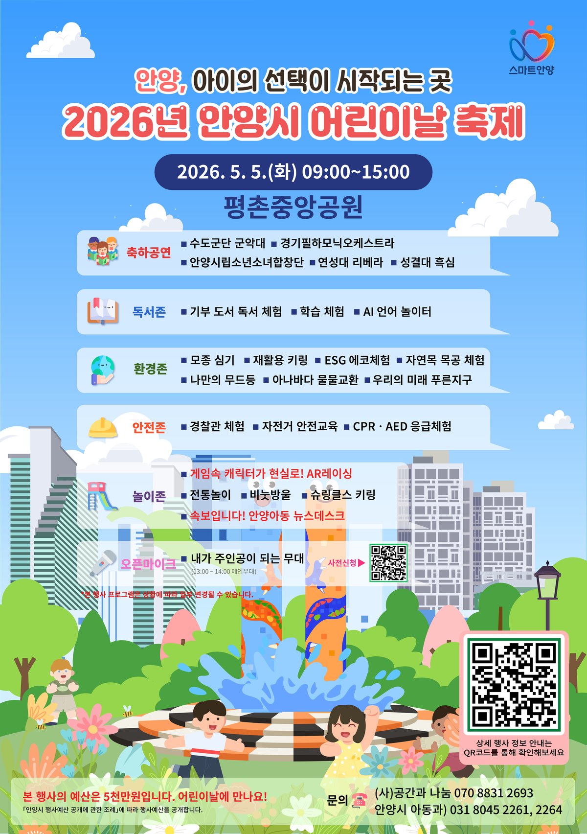 시는 오는 5월 5일 오전 9시부터 오후 3시까지 평촌중앙공원에서 '안양시 어린이날 축제'를 개최한다고 30일 밝혔다. 이번 행사는 “안양, 아이의 선택이 시작되는 곳”을 주제로 어린이들이 주체적으로 참여하는 데 초점을 맞췄다.