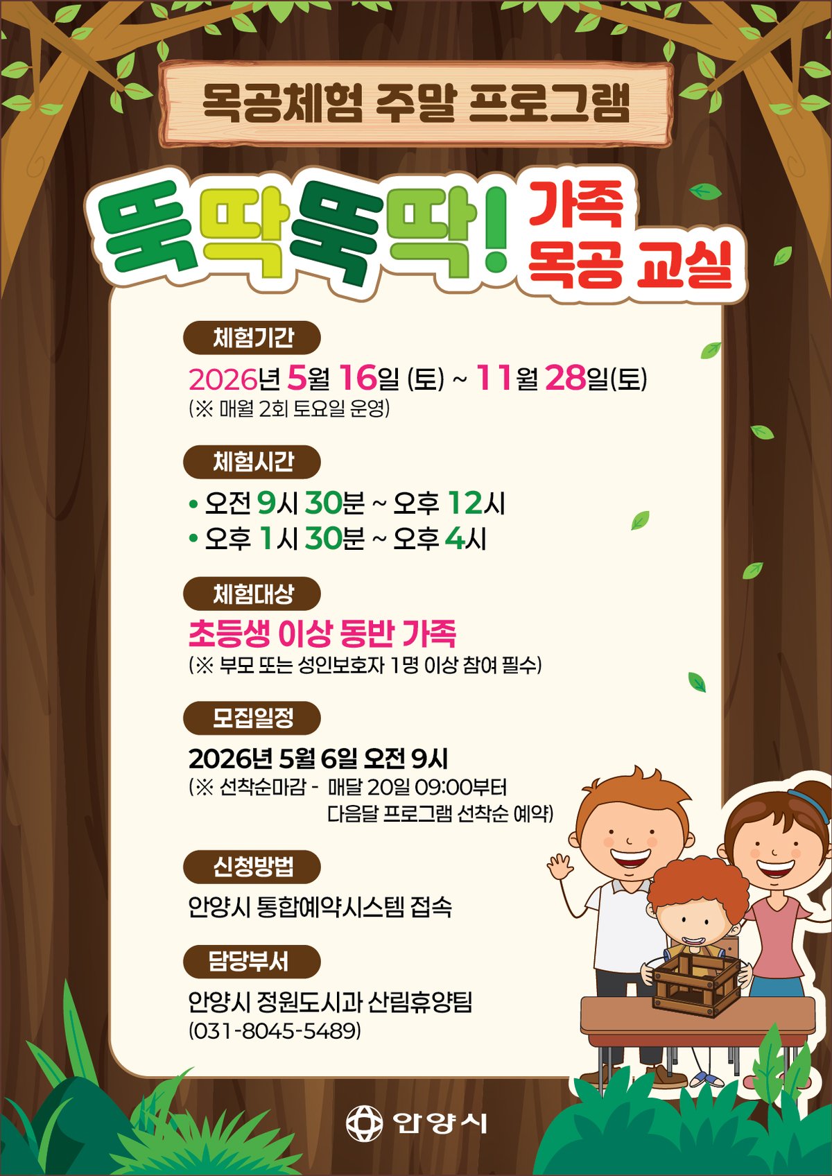 참가 희망 가족은 2026년 5월 6일 오전 9시부터 안양시 통합예약시스템을 통해 선착순으로 신청하면 된다. 모든 체험비는 무료다.